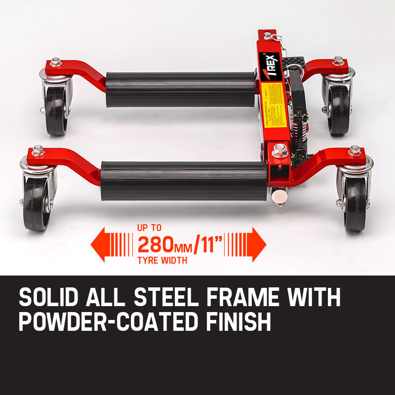 This pair of sturdy 12" T-REX Positioning Jacks make manoeuvring your vehicle safe and easy, without touching the chassis! Constructed from high-quality powder-coated steel, they have an impressive lifting capacity of 680kg each.