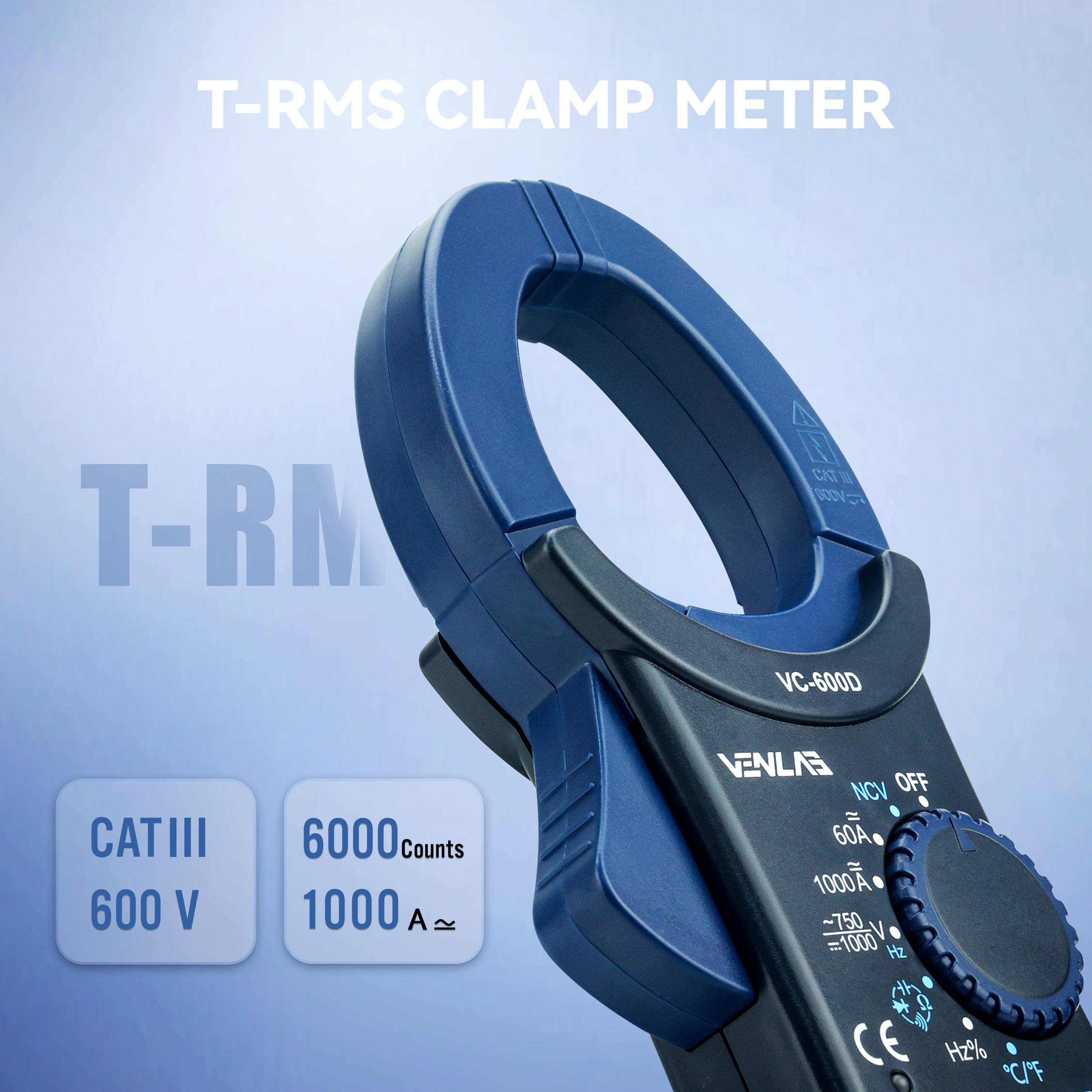 • VENLAB Digital Clamp Meter 1000A T-RMS 6000 Counts AC/DC Current Amp Meter, Multimeter Voltage Tester Auto-ranging, Measures Voltage Temperature Capacitance Resistance Frequency Continuity(VC-600D)