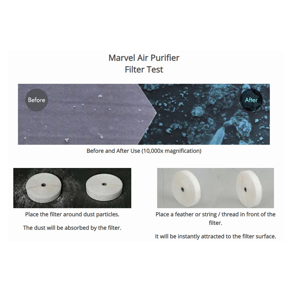 The Marvel air purifier removes harmful pollutants including super fine dust, carbon monoxide, cigarette smoke, vehicle exhaust fumes, pollen, mould, viruses, allergens, bacteria, and Volatile Organic Compounds (VOCs) such as formaldehyde, toluene, and benzene. This is all thanks to its powerful e-Nano filter that efficiently clears the air of airborne allergens and pollutants as small as 0.03 micrometers in size.