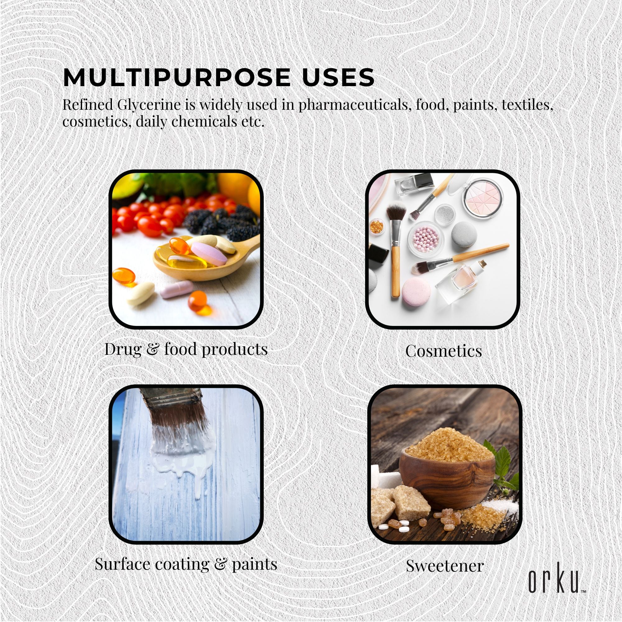 Refined Glycerine is widely used in pharmaceuticals, food, paints, textiles, cosmetics, daily chemicals etc.