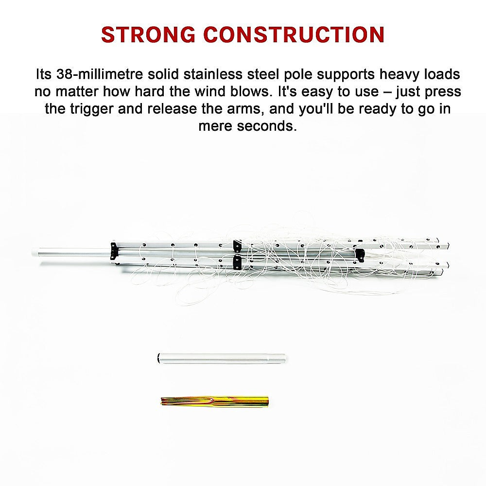 Its 38-millimetre solid stainless steel pole supports heavy loads no matter how hard the wind blows. It's easy to use – just press the trigger and release the arms, and you'll be ready to go in mere seconds. When you're done, simply fold up the arms until the next time you do your laundry. It comes with its own cover so that you can keep the line clean. It's easy to install and even comes with a ground spike, so you can get it up and running without a trip to the hardware store. With its mould-proof line, you'll never have to worry about mildewy laundry, even on humid days.