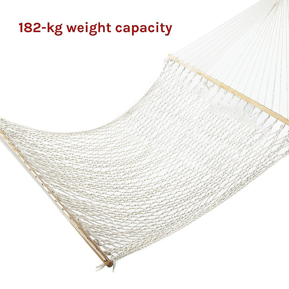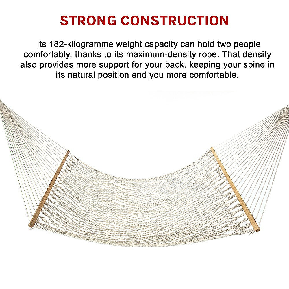Its 208-centimetre bed can accommodate practically all your taller family members and friends. And, its 182-kilogramme weight capacity can hold two people comfortably, thanks to its maximum-density rope. That density also provides more support for your back, keeping your spine in its natural position and you more comfortable. Each rope pulls against the others to create a lattice design, avoiding uncomfortable knots in the actual bed section. Double-looped strands connect the bed section to the hand-crafted ring knots making the bed extra strong and durable. With more than 304.8 metres of dense cotton fibres supporting you, all you need to do is relax.