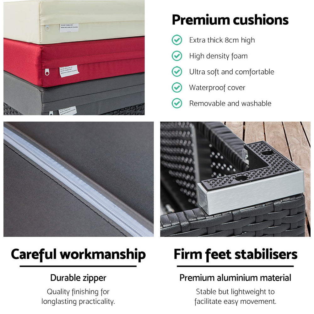 Please note: This combo piece comes with three cushion covers in red, white, and grey, and one storage cover for the table. We also provide one storage cover for two sun lounges. Kindly place the two sun lounges one upon the other for a perfect fit.