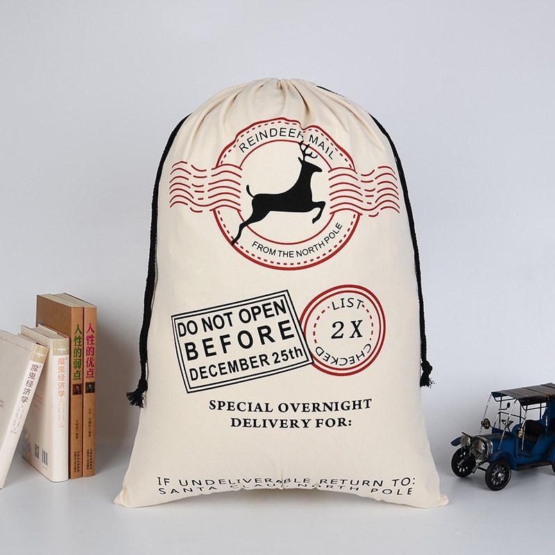 50x70cm Canvas Hessian Christmas Santa Sack Xmas Stocking Reindeer Kids Gift Bag, Cream - Elf Express