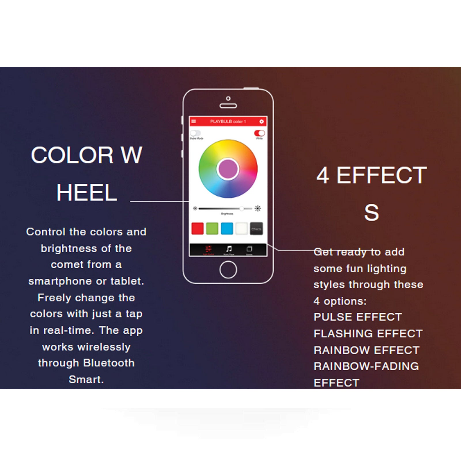 With the free Playbulb X app available from the Apple App Store and Google Play Store, you can control your Playbulb Comet with ease - all over a wireless Bluetooth connection.