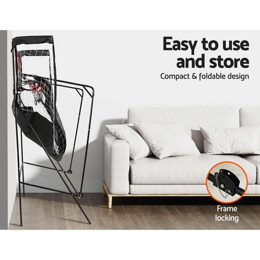 Bring the thrill of the arcade home with your very own Basketball Shooting Machine. The game is made from quality coated steel tubes that are rust-resistant as well as stain-resistant 200D printed polyester fabric that is sturdy and durable, so you can use it indoors or outdoors. Comes with 8 different popular game modes to challenge your friends and family to thrilling games of skill. Realistic sound effects make you feel like you're actually at your local arcade hotspot. The LED automatic score counter provides an accurate and impartial referee for two players, no fighting on the courts! The high net catches stray balls and returns them quickly and easily so you can get back to fun. The triangle frame design and anti-slip feet always keep the game stable. With a foldable, portable and easy-to-assemble design, you can play basketball in minutes, whether at home or on the road. Game on to victory with your very own arcade-style Basketball Shooting Machine.
