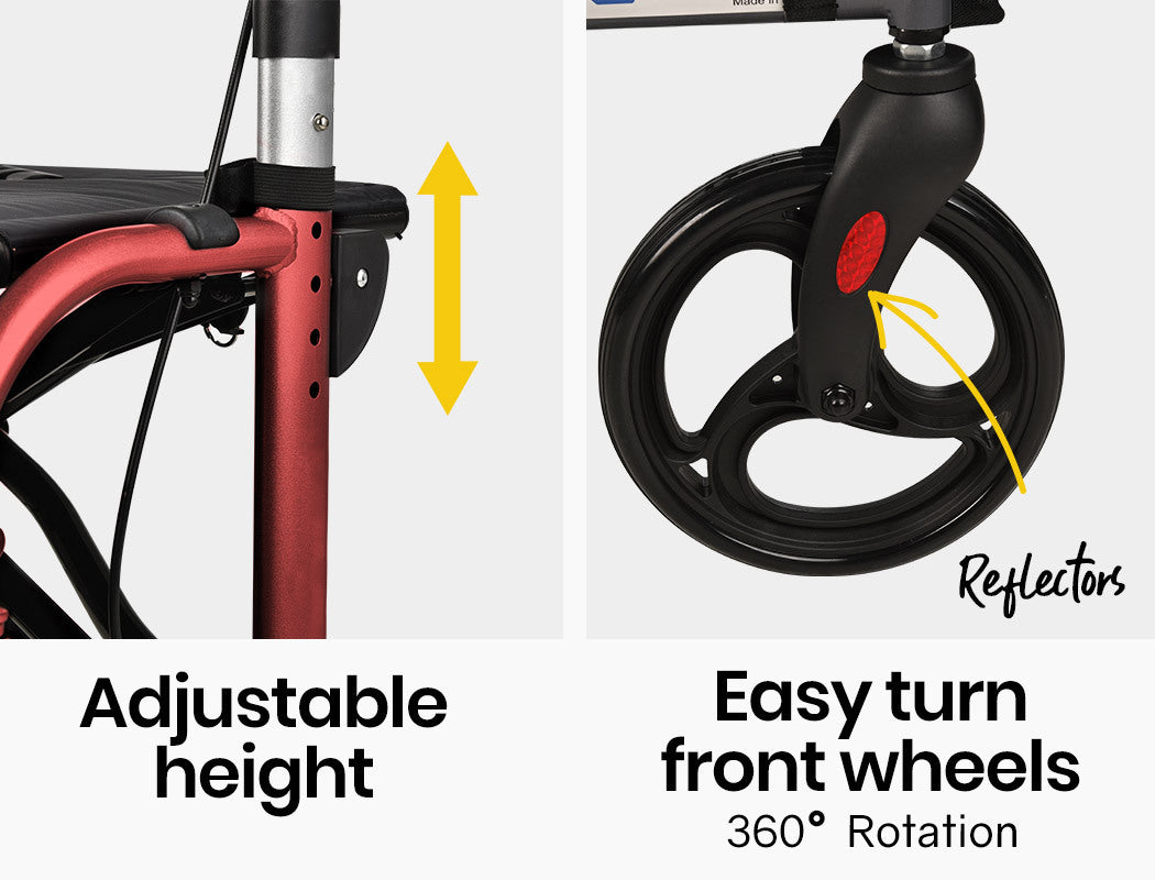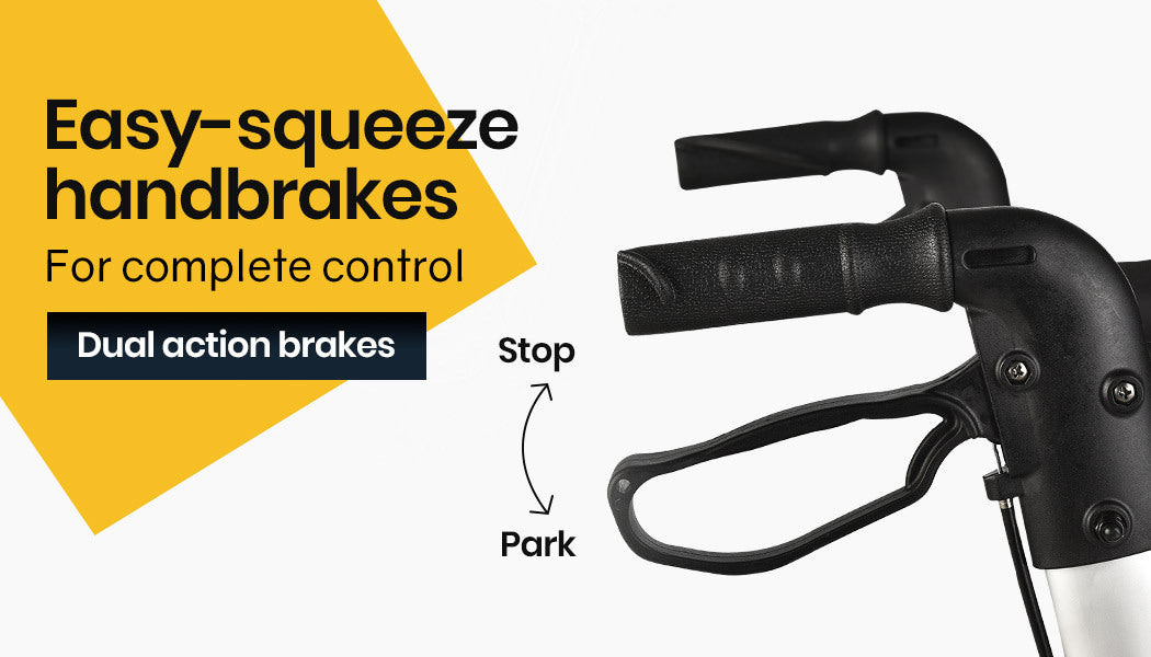 Venture outside on the large 8†PVC wheels which are designed to roll the walking frame smoothly over the bumps inside and outside. Activating the park brake ensures you have a stable seat for a rest to watch the world go by.
