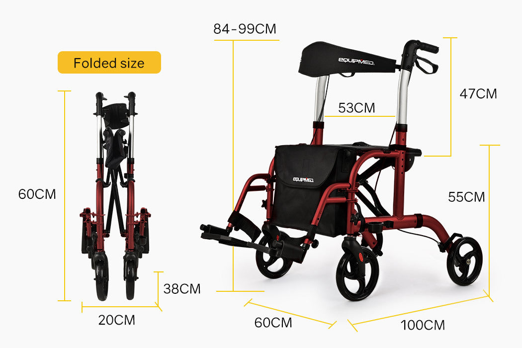 Make the smart choice and enjoy well-deserved safe mobility with the Equipmed SmartRoller 2in1 Rollator and Transit Wheelchair.