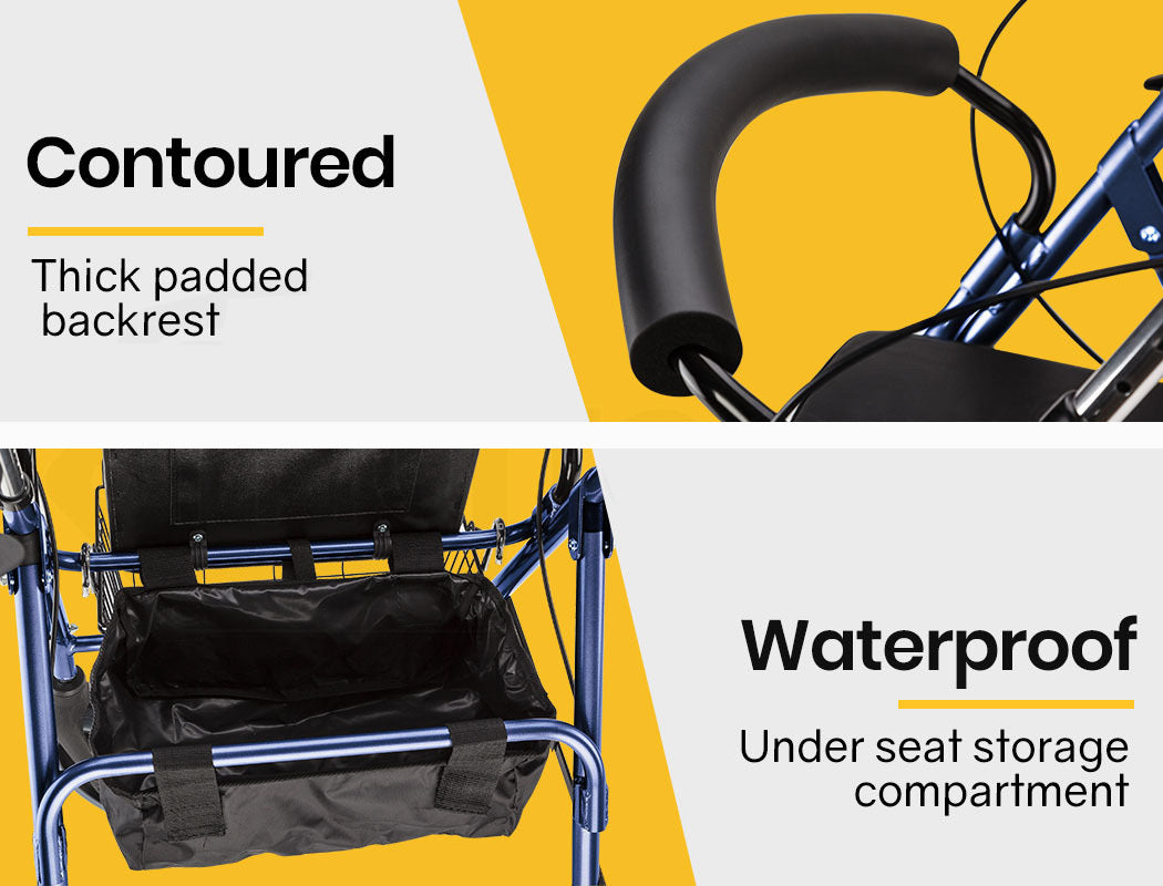 With dual-action loop handbrakes, adjustable handle height, contoured grips, padded seating and a comfortable padded backrest, your Equipmed rollator walker offers great ergonomics and comfort.