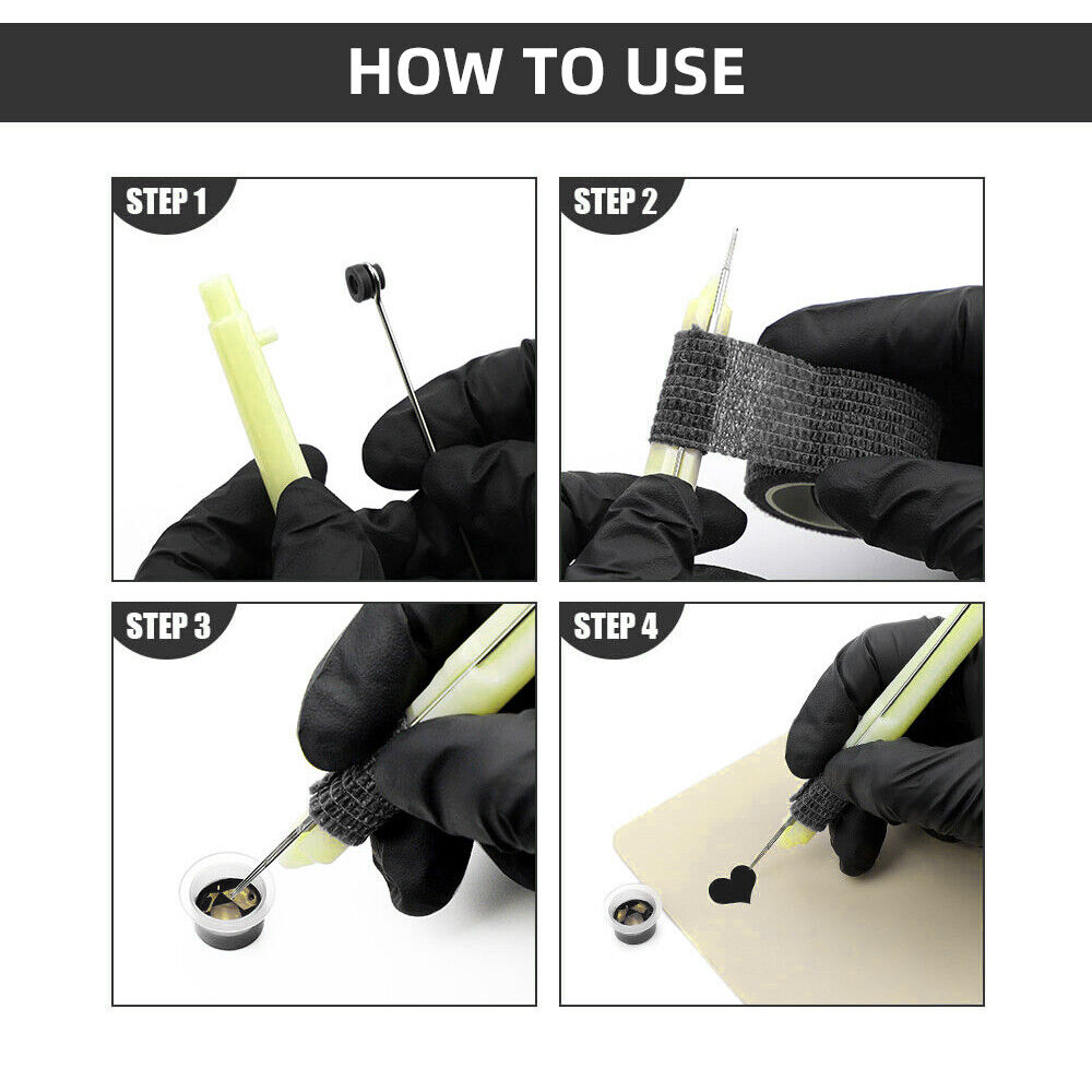 This DIY tattoo supply kit includes 1pcs tattoo pen, 1pcs disposable self-adhesive elastic bandage, 1pcs black tattoo ink, 1 pair of gloves,1 PCS Razor,10pcs tattoo grommets, 10pcs ink cups and 40pcs tattoo needles.