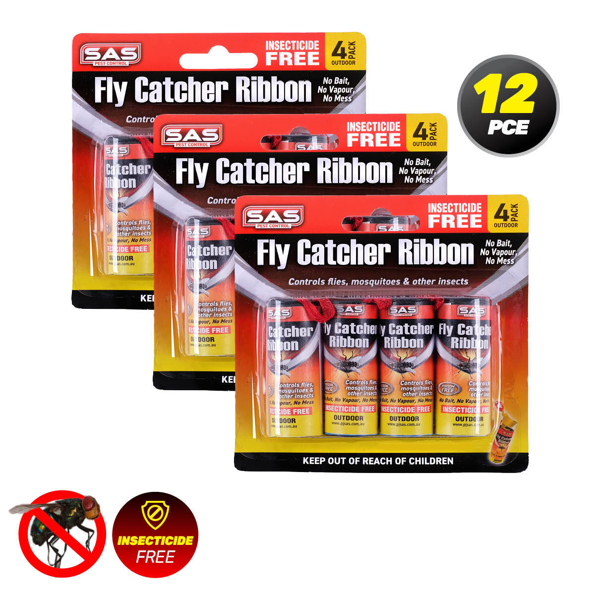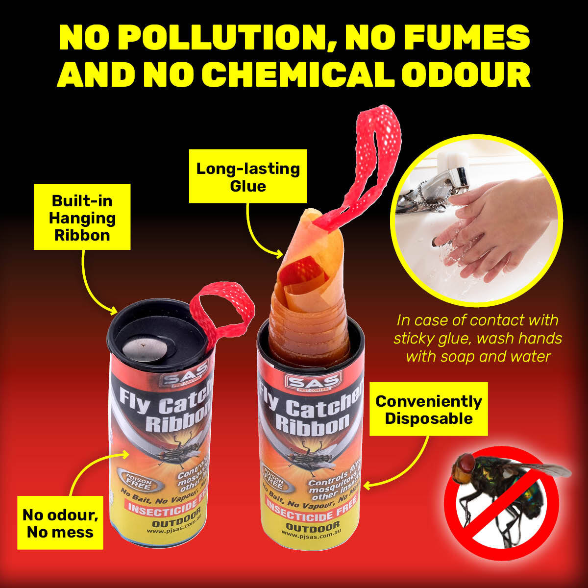 SAS Pest Control® A no-mess alternative to getting rid of those pesky insects. A simple to use design with sticky ribbon, it attracts flies, mosquito, flying ants and other insects. Odourless and insecticide-free this catcher is disposable with a convenient built in handle perfect to hang around your outdoor and entertainment areas.
