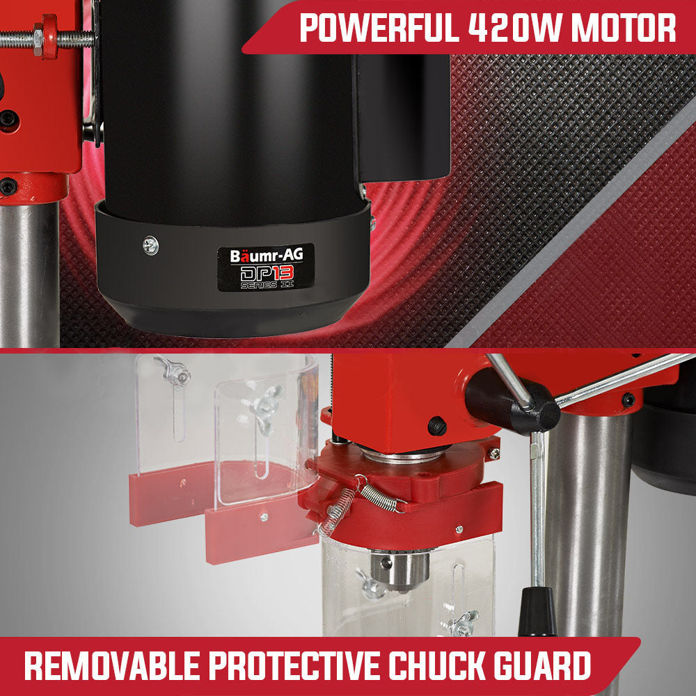 The NEW Baumr-AG DP13 Series II Bench Drill Press is the cornerstone addition to any workshop. Featuring nine speed variable RPM settings, a 13mm solid stainless steel chuck and a powerful 420W motor, this bench mounted unit offers the torque, components and versatility required to execute a range of drilling tasks through a whole host of materials.