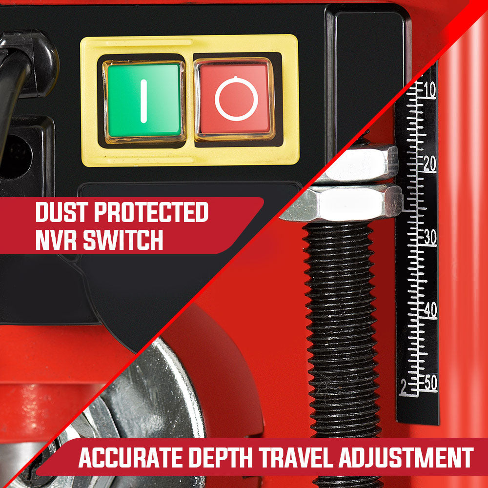 The DP13 Series II has been designed with smooth, powerful and consistent drilling in front of mind. Its 50mm depth adjustable drill travel is accompanied by a sturdy height adjustable work table, accommodating the various types of objects to be drilled and the precision required. Moreover, the work table is also angle adjustable to 45° in either direction. The three spoke handle works in harmony with the rack and pinion spindle feed to produce a clean and fluid press. The removable chuck guard offers user protection and is also designed to be set out of the way for exposed drilling. For further protection, the DP13 Series II also comes fitted with dust protected NVR switches, so no restart will occur once power is restored in the event of an outage.
