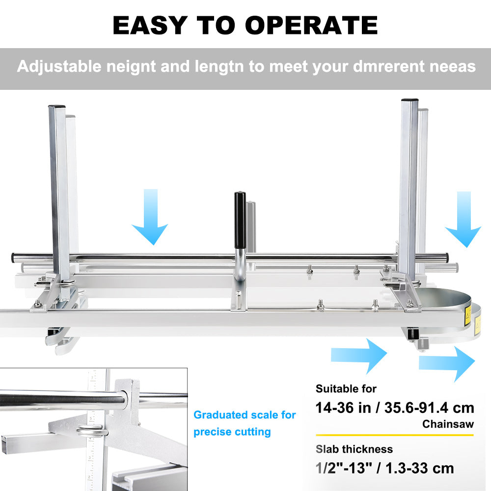 The height and length of our saw mill are both adjustable to meet your different needs. It is compatible with a 14" -36" chainsaw(not included).