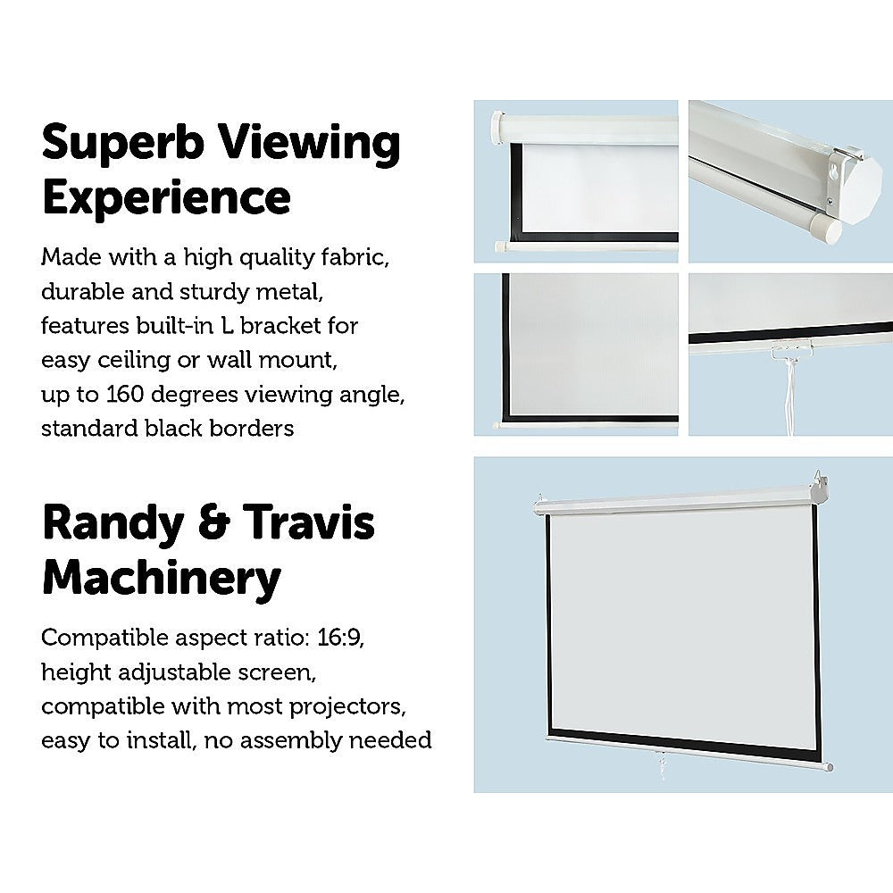 Whether it's for viewing old slides or films on the big screen, this projection screen from Randy & Travis Machinery is perfect for popcorn time. Both ceiling- and wall-mountable for use inside and out, this screen will provide you with hours of fun with your family and friends without having to squint. So, instead of paying high ticket prices at the theatre, save money and watch your favourite movies right at home. Measuring 100 inches across the diagonal in a 16.9 widescreen format, it allows everyone to enjoy home movies and videos from anywhere in the room. With a 1.1 gain and a viewing angle up to 160 degrees, it prevents hot spots and provides the utmost in clarity and image reproduction.