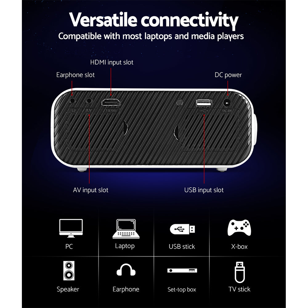 From the small screen to the big screen, now you can enjoy epic entertainment with our Devanti Video Projector. With its ultra-expansive colour gamut, the projector delivers crisp clear images with more brilliant colours to give you the best viewing experience. The projector is compatible up to 1080p, so you won’t have to compromise on quality. Using Wi-Fi connectivity, our video projector effortlessly supports screen casting from your iPhone, iPad, smartphone, tablet or laptop, so you can stream content cable free. It also features a built-in heavy bass speaker and a high-lumens lamp with a lifespan of up to 30,000 hours. For even more entertainment value, the projector includes HDMI, USB, AV and 3.5mm audio ports for fast connection to multiple devices such as external speakers, game consoles and hard disks. Get the home cinema experience and order today! Include remote control and additional AV audio cable.