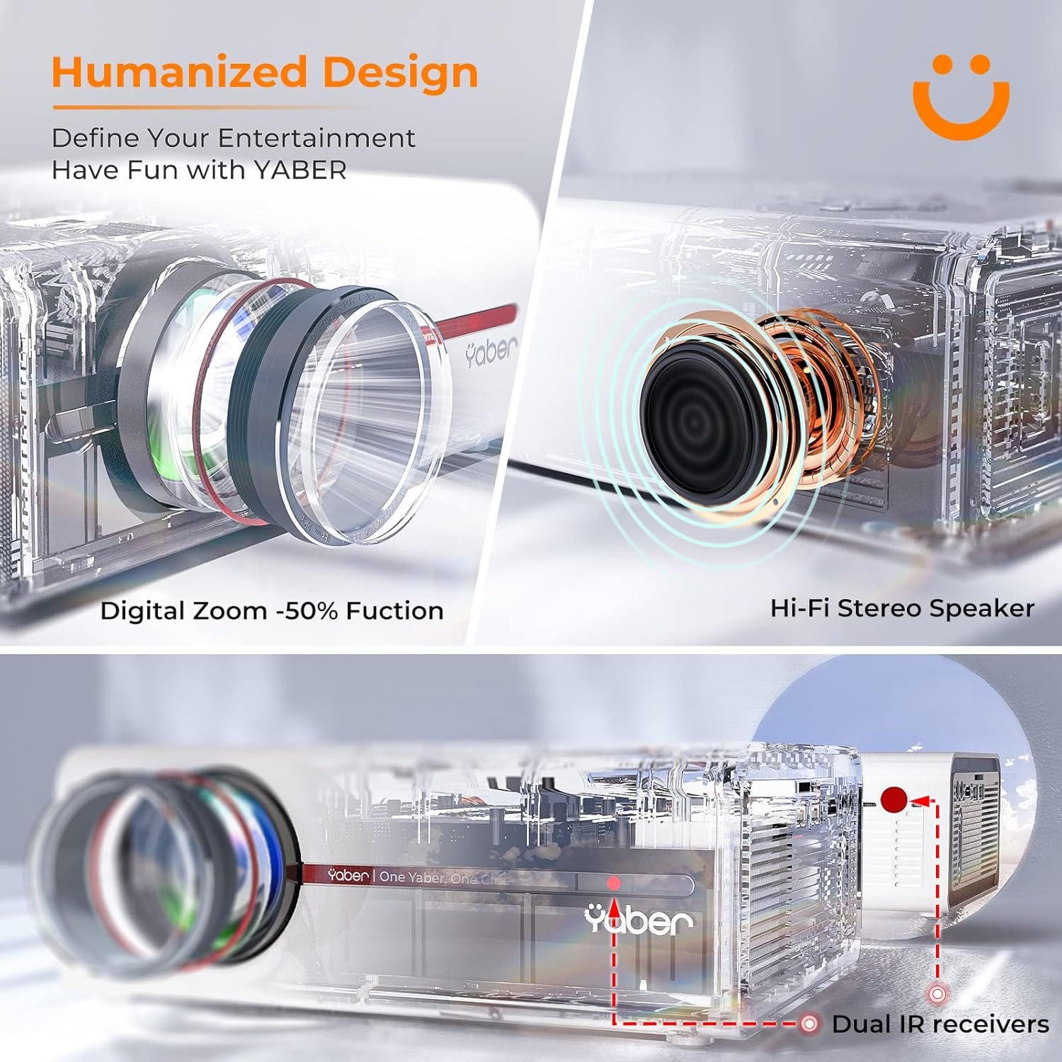 • Dual Infrared Receivers: YABER V5 mini projector uses the built-in front and rear dual infrared receivers for the first time, which can fully cover various remote control blind spots around the fuselage, effectively solving the remote control failure and making the placement of the projector freer.