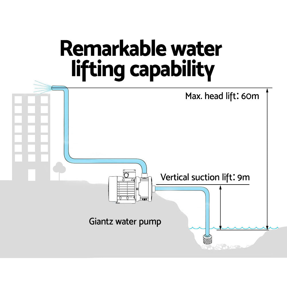 When low water pressure gets you down, power it up with our Giantz 5-stage Water Pump. It is the perfect solution where constant on-demand water pressure is needed at the open and close of any tap. You will find our water pump particularly useful for homes, household gardens, farms, commercial entities or any situation where pressurised water is consistently required. The water pump features an IP-rated commercial motor, full stainless steel pump body, cast iron ends, 1.25'' inlet and 1'' outlet ports, corrosion-resistant brass connectors, efficient cooling system and not least, built-in thermal protection. Pumping out at a rate of 150L/min with a 60m head, the 2000W water pump can send water up to two stories high effortlessly. You can also accurately control the pressure to your precise requirements with the fully automatic controller and monitor it at a glance of the pressure gauge. Power to the pump is as simple as plugging it straight into any Australian standard socket. Whether you are using the pump as a permanent installation or on an ad hoc basis, you can be assured of dependable and reliable water supply in more ways than one.
