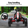 Made of a very sturdy steel frame with oxygen-welded joints for extra stability and durability, the Kids Go Kart has a large and adjustable seat with a high back rest for maximum comfort. Pedal power is assisted by a forward and reverse control and a sporty and highly responsive 3-point steering wheel. The large pneumatic rubber tyres provide good grip and traction as well as good shock absorption for a smooth ride. And for safety, the bike chain is fully covered to prevent any injury whilst the manual brake is super effective too. Not least, the striking colours and finishing simply look awesome.