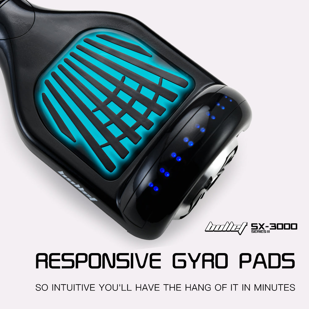 The NEW Bullet SX-3000 Series III Electric Hoverboard Scooter brings a whole new concept of travel to the streets. This state-of-the-art self-balancing device reacts instinctively to your body's shifting movements for highly responsive acceleration, turning and reversing.