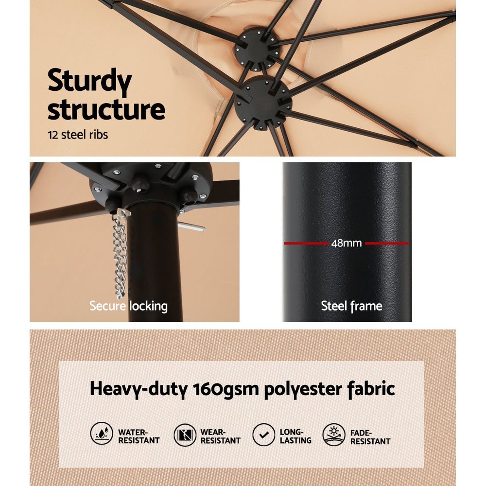 It can be hard trying to fit everyone under one roof. Now you never have to worry about space again thanks to the Instahut Twin Outdoor Umbrella. This extra-large patio umbrella is perfect for summer picnics, BBQs or family beach days, thanks to its 4.57m diameter and double-sided canopy. Made from UV+50, 3-layer, water-resistant and UV-resistant polyester fabric and with the support of 12 steel ribs, the canopy will last you through all kinds of weather. It is easily operated by hand using the heavy-duty, fail-safe handle supported by a powder-coated steel pole and durable steel base. Secure your brand-new umbrella with an Instahut Umbrella Base. Featuring a sturdy 4-plate design constructed from heavy-duty HDPE plastic, the stand is built to withstand moderate gusts of wind and is anti-fade. To use, simply fill with water through the fill spout and insert your umbrella. When fully filled, each piece weighs approximately 15kg, giving you a combined weight of 61.61kg. Use in a 2, 3 or 4-plate configuration to best suit your needs. When the day is done, simply empty the plates and carry them home with the convenient carry handles. Enjoy the outdoors to the fullest with an Instahut Umbrella and Base Set.