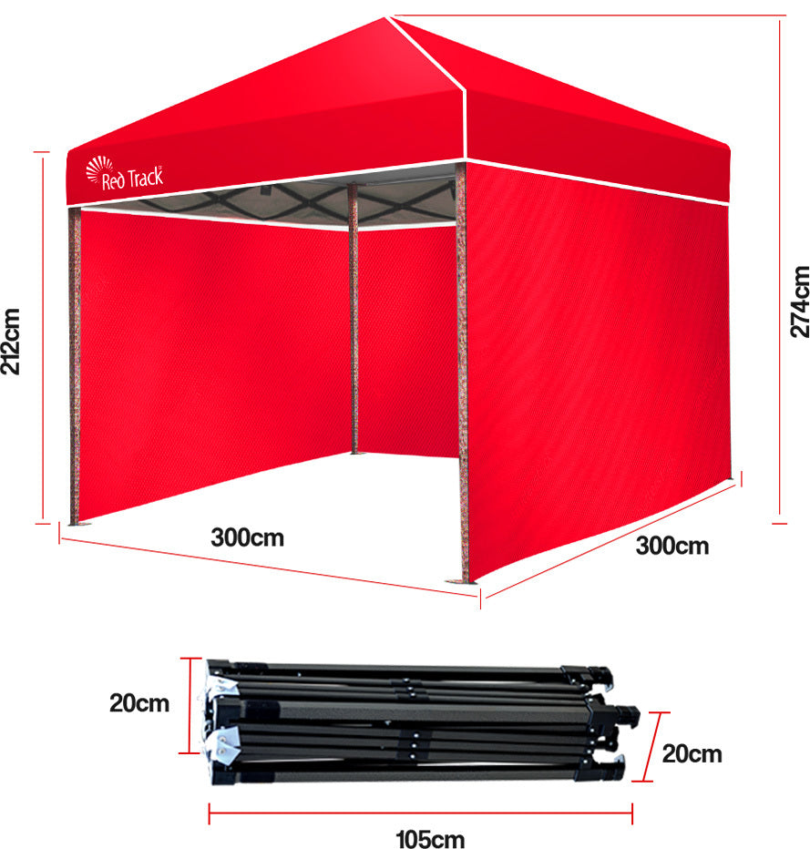 The Red Track Portable 3x3m Gazebos are designed with convenience, stability, and durability in mind. Featuring a patented design, this Red Track Gazebo folds down to be the most compact 3x3m model on the market, for convenient transportation and storage.