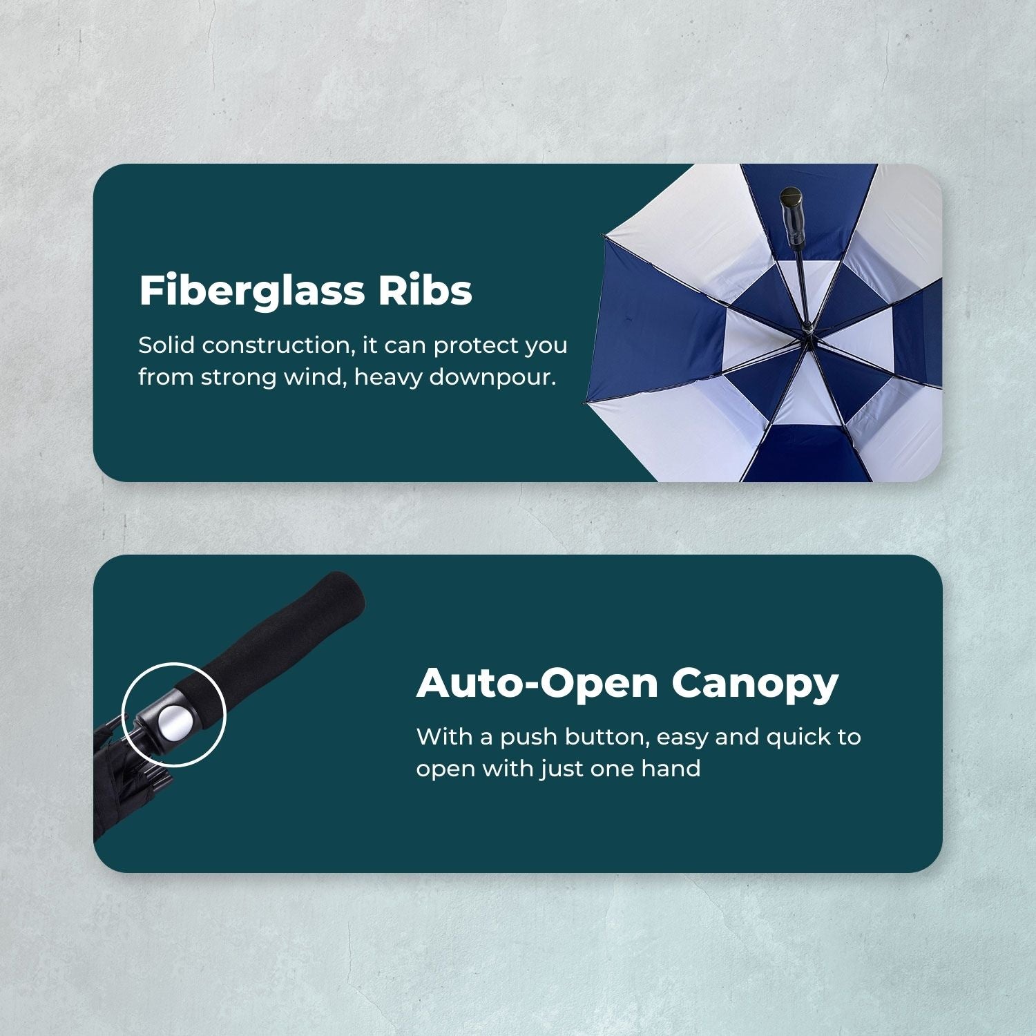 With a 62-inch Oversize canopy, Comfortable grip, Solid Fiberglass ribs, it can protect you from strong wind, heavy downpour, or even under the sun.