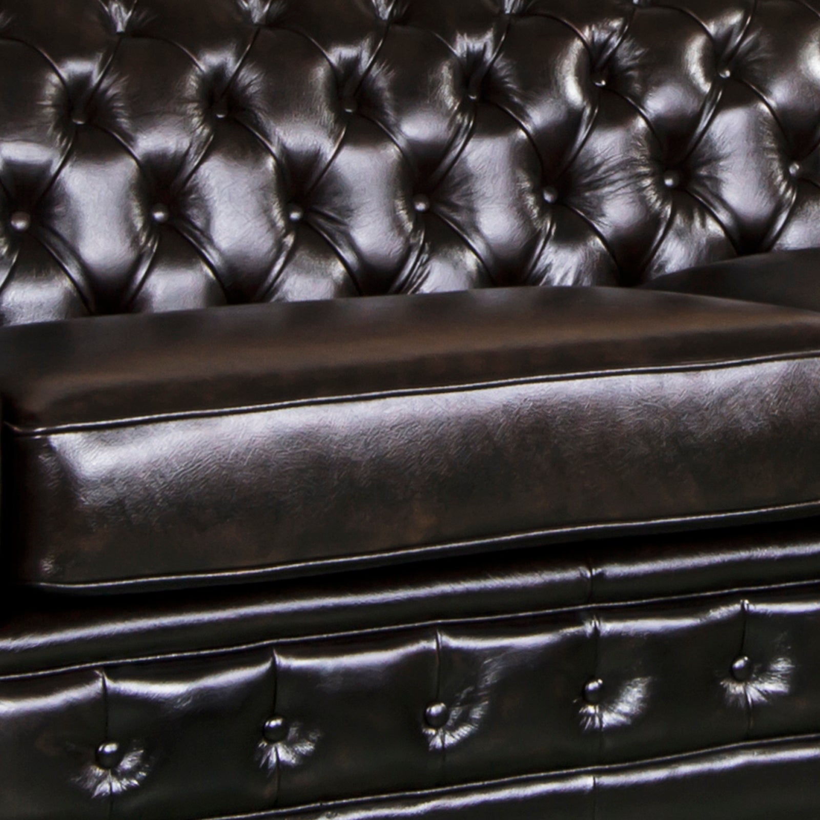 This sofa is completely upholstered with genuine Leather and has deep quilting for stylish look. We use high resilient foam in our sofas which will last longer and provide maximum comfort.