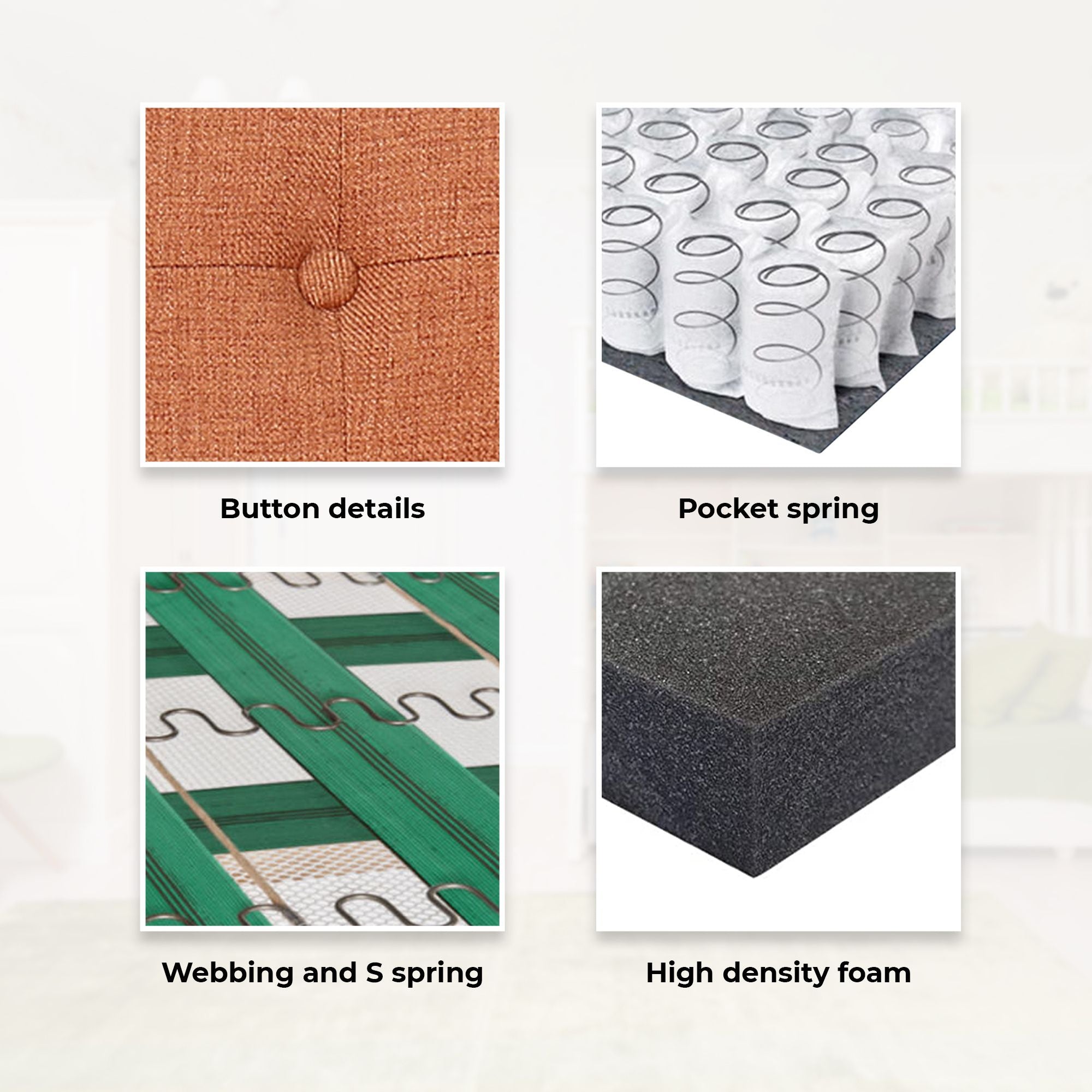 A sofa is the focal point of a living room. Place this beautiful sofa set that consists of a 1-piece 3-seater sofa and a 2-piece 2-seater sofa, designed in the Scandinavian style, in your living room to fill it with elegance. This sofa set is an epitome of superb craftsmanship. They showcase comfy looks, featuring tapered legs and outwardly sloping arms. They have a fixed backrest with button details and loose-style seat cushions with high-density foam for superior comfort. The sofas in burnt orange colour mix easily with any interior decor style. The entire sofa is upholstered in 100% polyester fabric, which is soft and durable. The stunning sofas also feature high-density foam, webbing, pocket springs, and S-springs that ensure complete relaxation for the body. The structural frame of the sofa is made of sustainably harvested solid wood and plywood, which gives it internal strength and resilience. The frame has a five-year warranty; the foam and springs have a three-year warranty; the fabric and stitching have a one-year warranty; and all other parts have a one-year warranty.