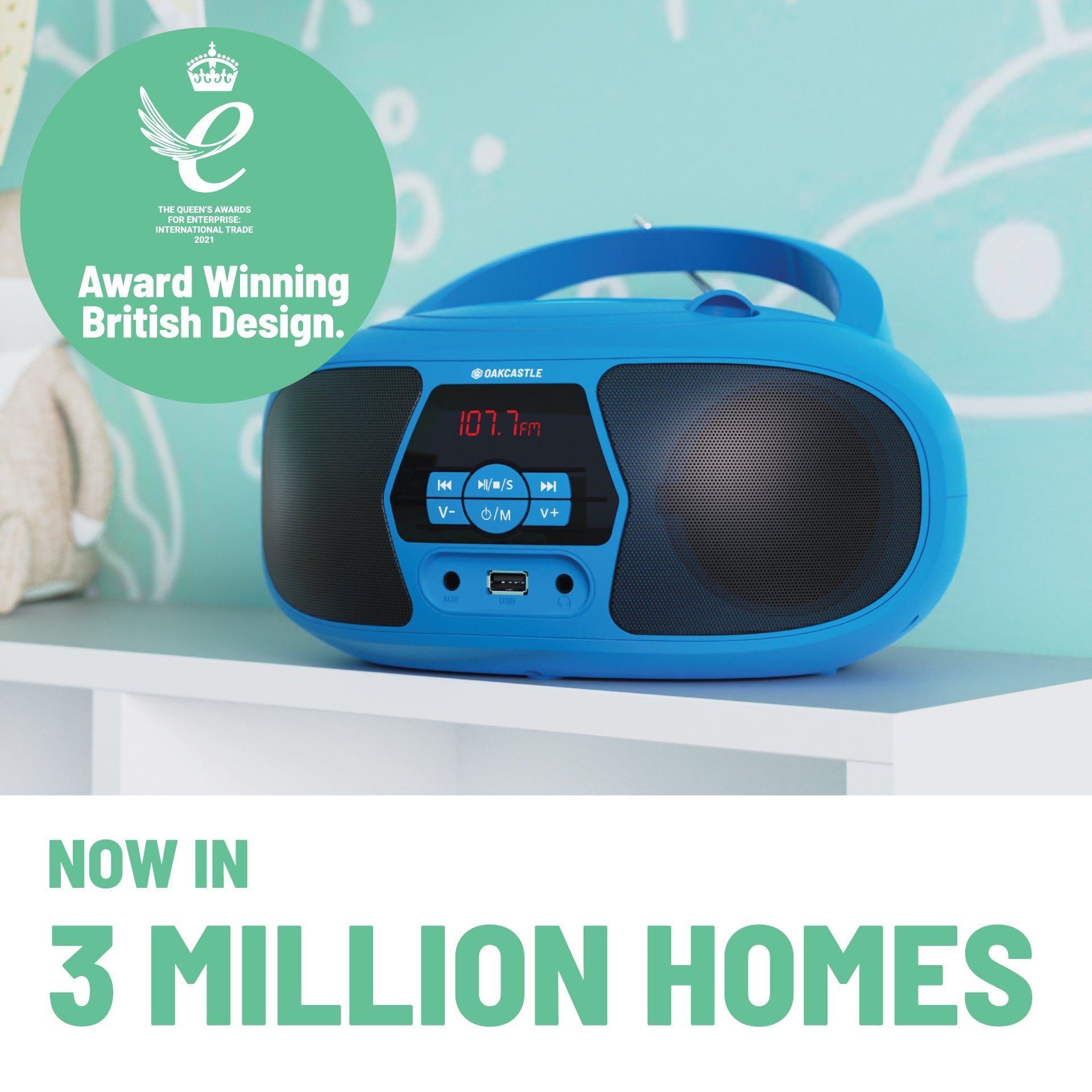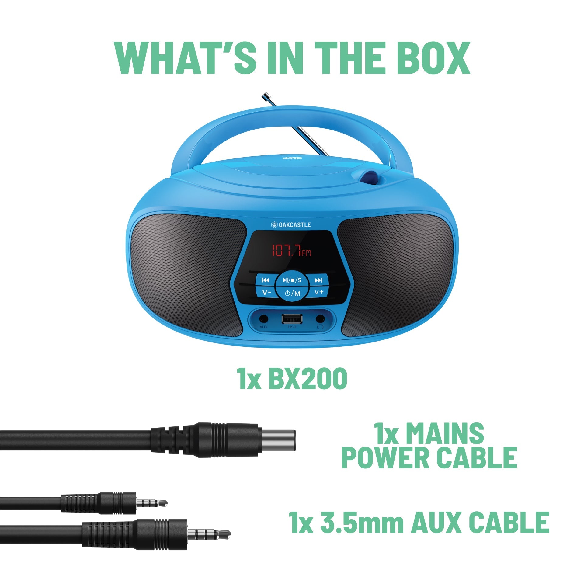 Majority Oakcastle BX200 Portable Bluetooth CD Player - Blue - No matter what the occasion or the location, the Oakcastle BX200 combines versatility with performance and portability. Offering a wide variety of features including a CD player, Bluetooth, FM radio and more, the BX200 lets you listen to all your favourite songs and stations in amazing stereo sound. The BX200 also comes with a handy carry handle and battery compartment so you can take it with you anywhere. The Oakcastle BX200 comes with a whole-host of playback functions and features so you can enjoy your music however and wherever you like. Flip open the top and insert one of your favourite CDs, plug and play from your media devices with the USB and AUX ports or control the tunes remotely with the built-in Bluetooth. The BX200 also comes with FM radio for even more listening choice.