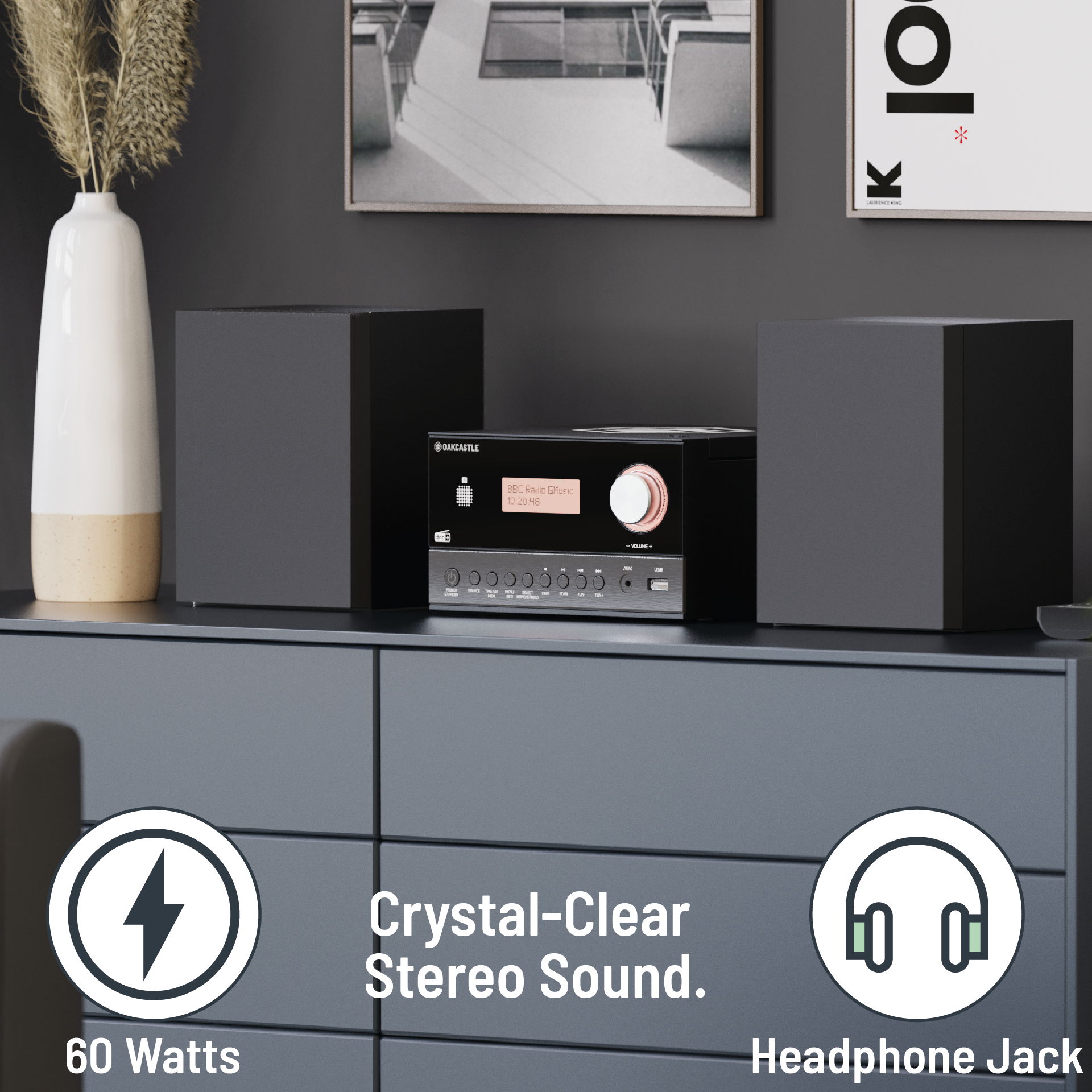 COMPLETE HOME MUSIC SYSTEM - The Oakcastle Hifi200 is designed in the UK by a group of audio experts. The micro hi-fi stereo system features a powerful pair of self-contained 2.0 stereo speakers capable of producing 60 watts. Our audio system features the latest in audio technology and is compatible with household items like your phone, tablet, MP3 or PC. Digital sound quality is designed, tested and perfected in Cambridge, UK.