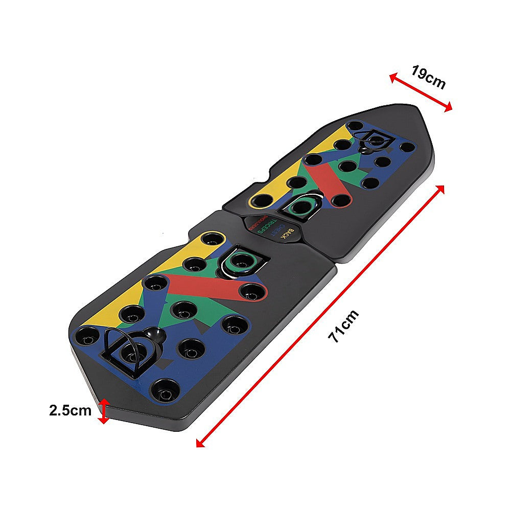 Experience the advance  and enhanced 13-in-1 push up bars with resistance bands. Designed for sculpting and maximizing chest, buttocks, shoulders, back, and triceps. Each colour targets specific muscles: blue for chest, red for shoulders, yellow for the back, and green for triceps.