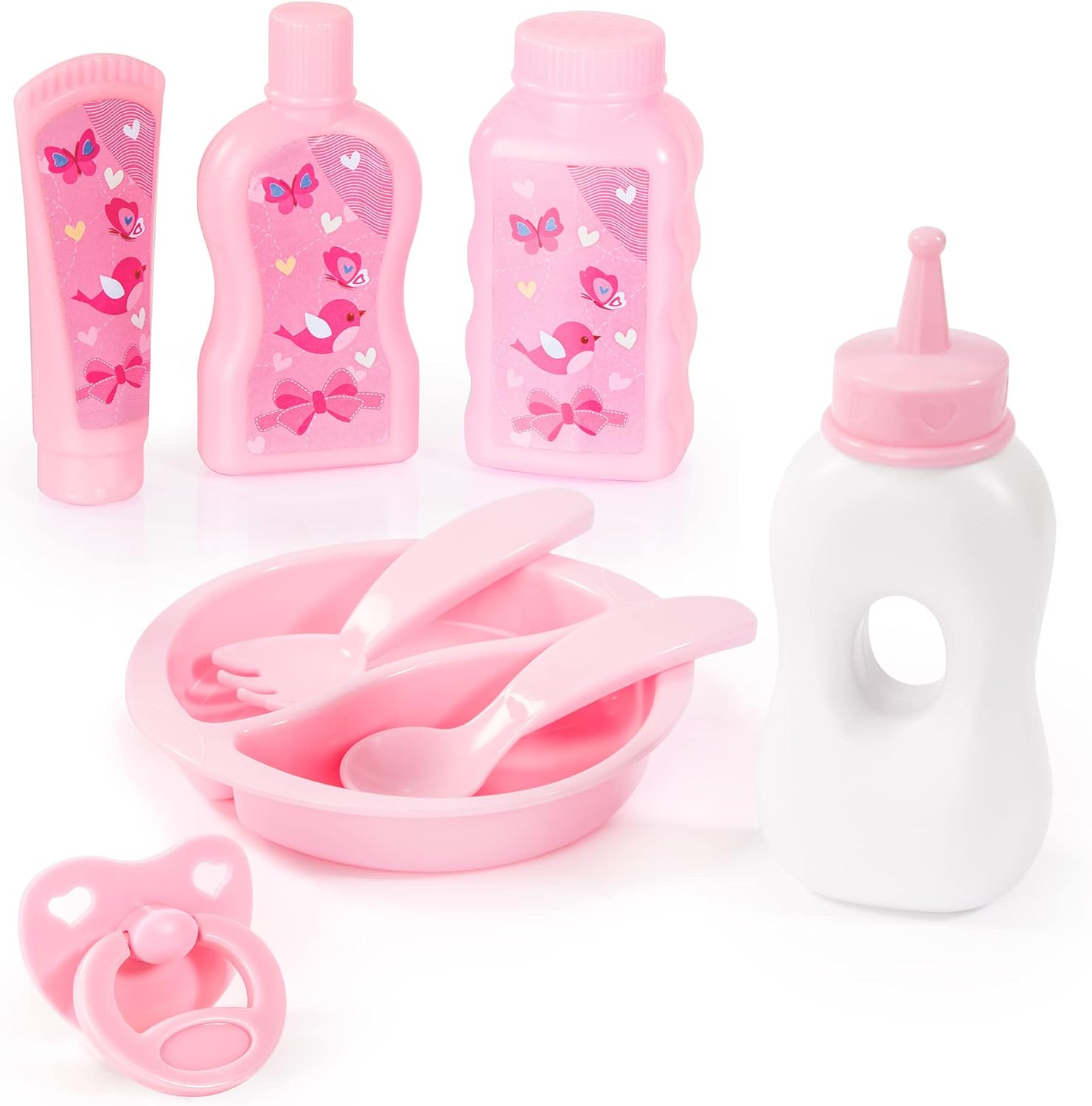 • This 11-piece set is the perfect companion for stylish parents on the go. It includes a pram, handbag, travel bed, four bottles, plate, spoon, fork, and pacifier - all you need to keep your little one comfortable and happy.