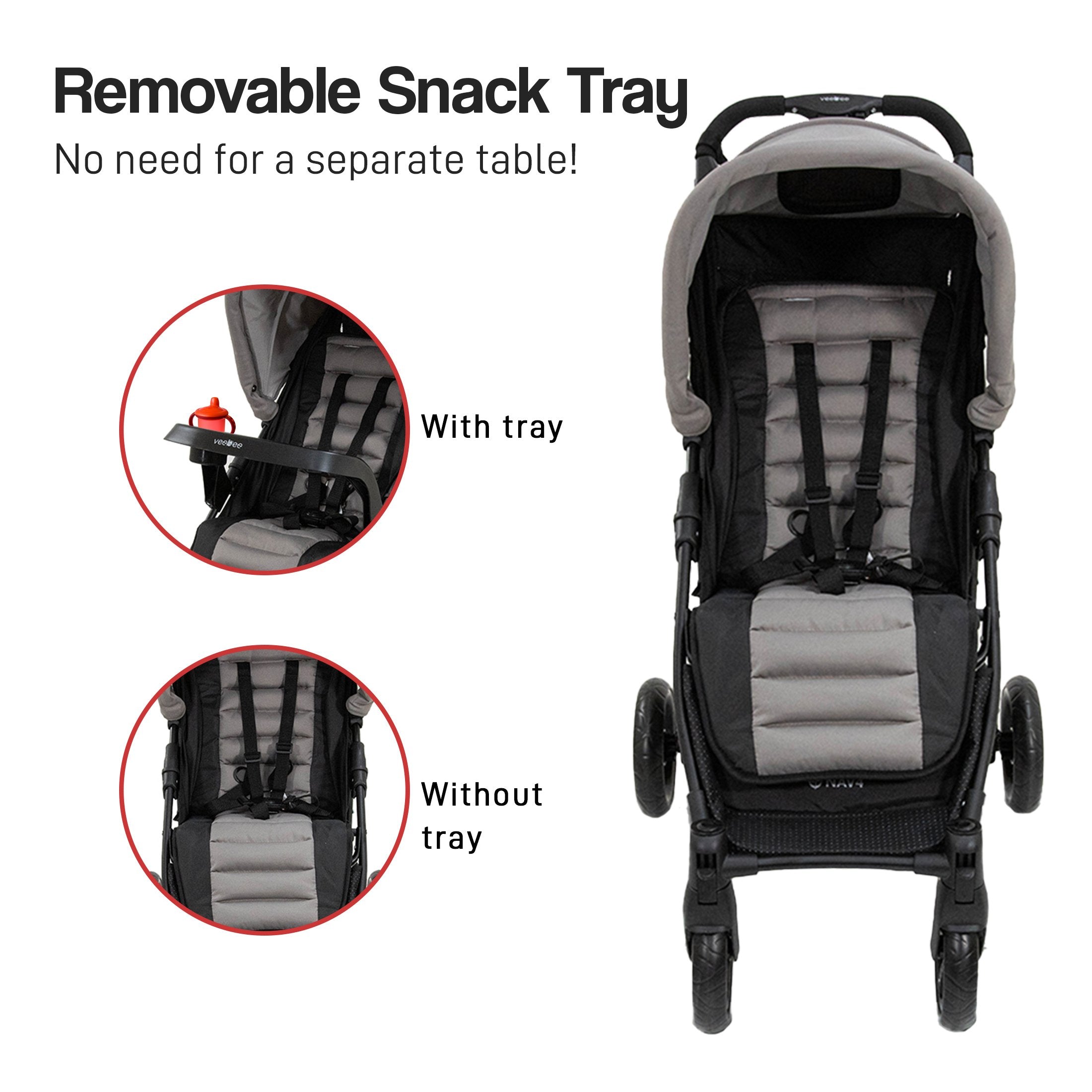 The NAV 4 is robust and sturdy, with four rugged wheels for unmatched stability. It has a retractable UPF 50+ canopy to block 99% of harmful UV-A and UB-B rays. The peek-a-boo window lets you check on your baby easily whether they are sleeping or sitting. Plus, the fully reclinable seat and adjustable footrest ensure that your little one stays comfy. Other features include a spacious storage basket and a removable snack tray