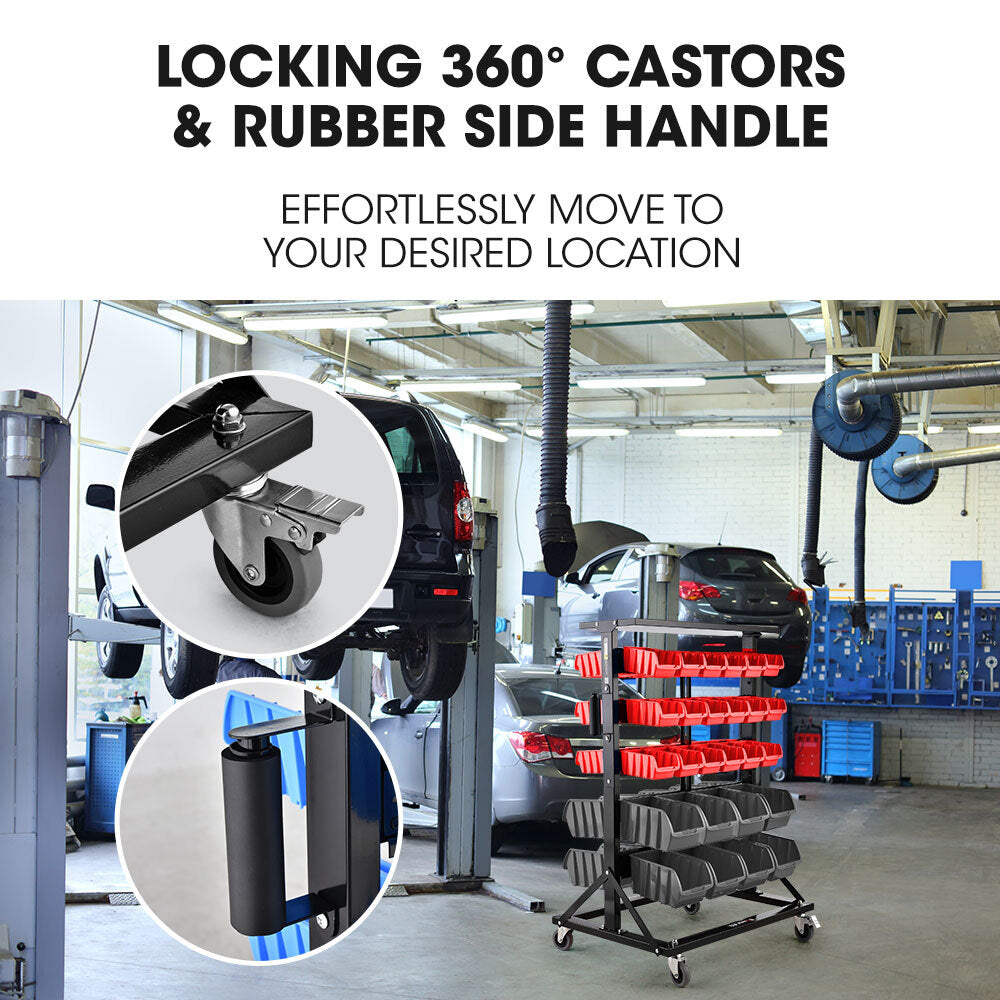 The tough injection moulded polypropylene tubs come in two sizes and are easy to remove and place back on the rails. Slots on the front of the tubs give you the option of labelling your parts and hardware. Locking 360° castors and the rubber side handle allow you to effortlessly move the rack to your desired location.
