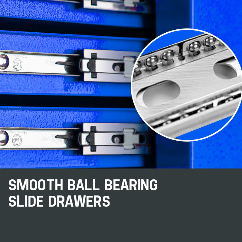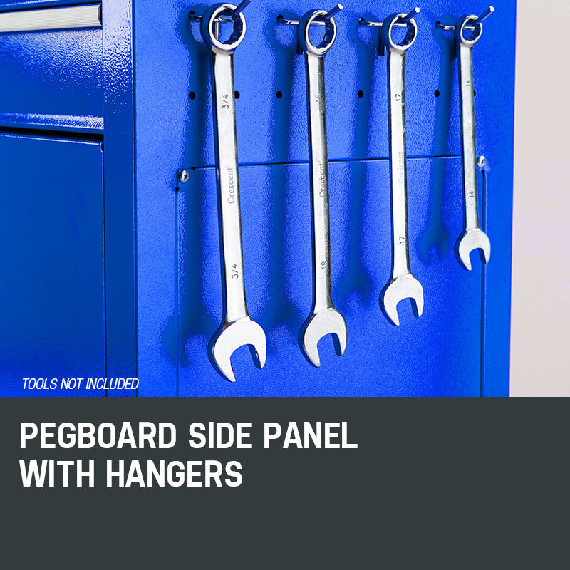 Both the cabinet and chest are built with high tensile powder coated steel enclosures. The top of the cabinet features an impact absorbent gripped surface to keep the chest secured firmly in place when mounted on top. Each drawer slides effortlessly in and out on smooth ball bearing rails, which makes finding and accessing each tool a cinch, and each drawer contains mesh grip liners to ensure your tools stay put when transporting. The cabinet also has a pegboard side panel with hangers and the chest is easily transportable thanks to its side carry handles.