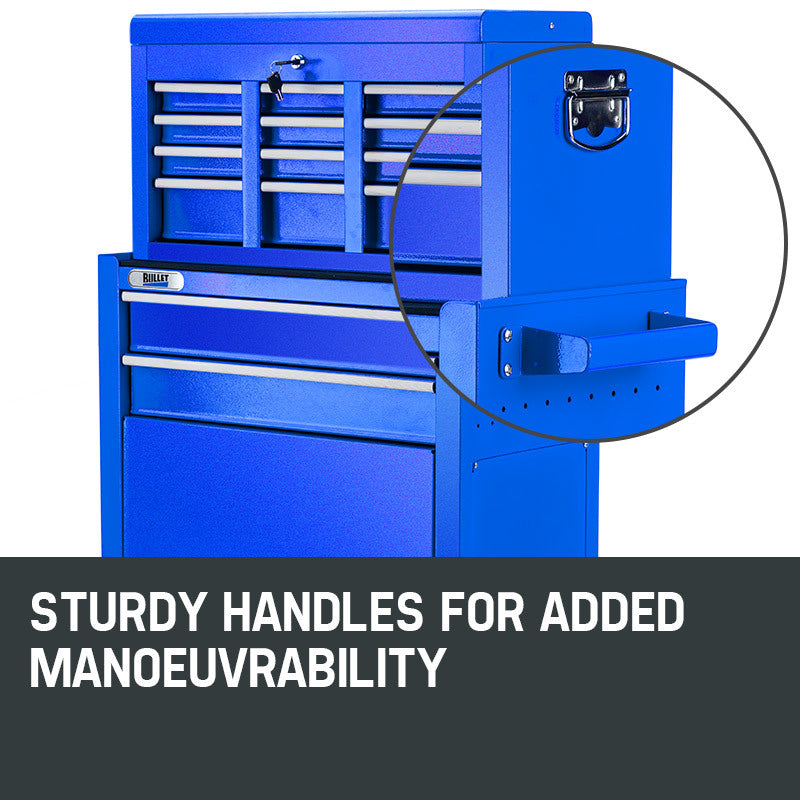 The New Bullet 8 Drawer Tool Box Cabinet is the ideal storage solution for all your tools, parts and hardware. Made with premium materials, this compact and manoeuvrable split unit is a must have for any garage or workshop. It provides a totally contained tool cabinet package designed to save you time, energy and make your work environment more manageable.