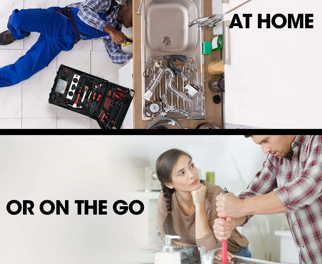 The tools are fitted in four secure removable blow moulded inserts layered within the case. Both its carry handle and telescopic handle coupled with the roller wheels allow for effortless transporting. Dual lock and key latches secure the case, with two keys included. This all-inclusive compact unit contains an incredible 925 pieces and fits discreetly in any room of the house.