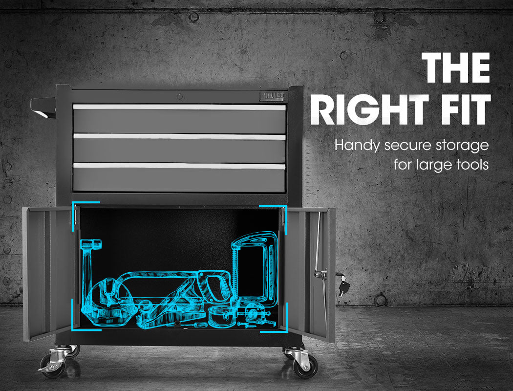 The cabinet rolls smoothly on rubber castors, and thanks to locks you have the option to secure it into position. This tool cabinet trolley offers an instant equipment and parts storage solution. It's a worthy addition to any garage workshop.