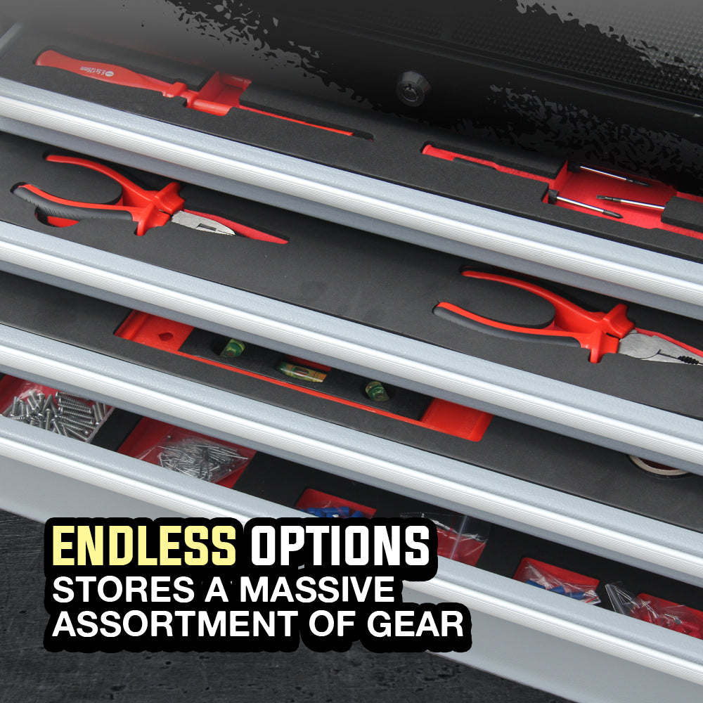 Have every odd-job and task around your home covered with the Bullet 622 Piece Tool Cabinet Trolley. This comprehensive metric tool kit comes with a huge assortment of practical tools ranging from sockets and pliers to a pick-up tool magnet. Made from high-quality chrome vanadium, these are dependable and enduring tools that perform to an exceptional standard. The cabinet itself is built with a high tensile powder coated steel enclosure, and its top layered with an impact absorbent rubber gripped surface to withstand any occurring knocks and to keep anything mounted on it secure.