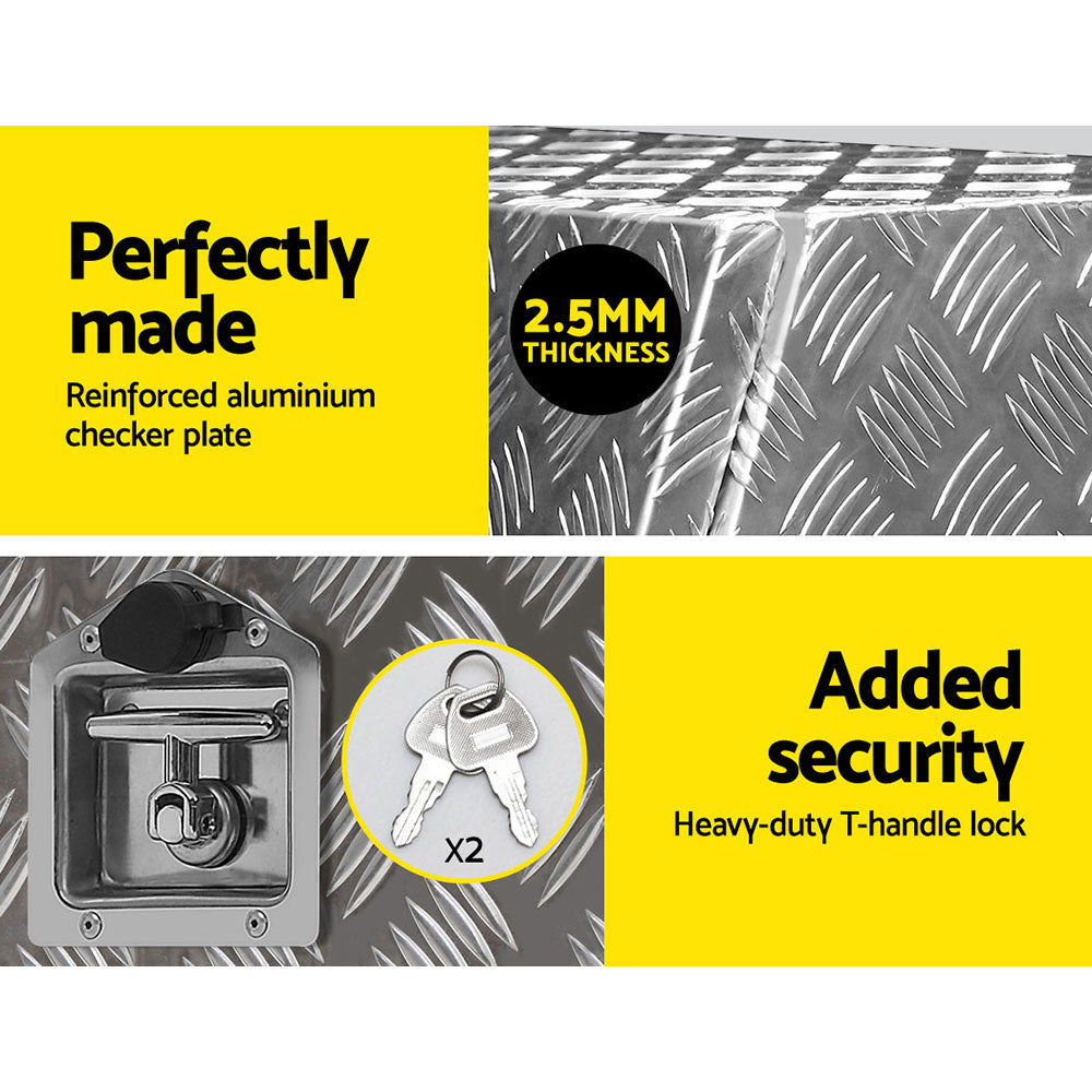 For reliable and safe tools storage, nothing beats our Giantz Aluminium Tool Box. Made of marine grade aluminium with a checker plate finish, this tool box is constructed with stainless steel piano hinge, rivets and bolts. The high-quality rubber sealing and fully welded seams also help to keep your precious equipment and tools clean and dry from the weather elements. The front opening lid ensures easy access and storage, and the gas lifts provide durable lid support. With five drawers, two shelves and a large storage room on the side, there is ample space for all your tools. The tool box is equipped with bolted on stainless steel T-locks for added security at all times and come with four keys so that you always have a spare. Best of all, you can mount the tool box onto your ute, trailer or truck so that you can take your tools wherever they are needed.