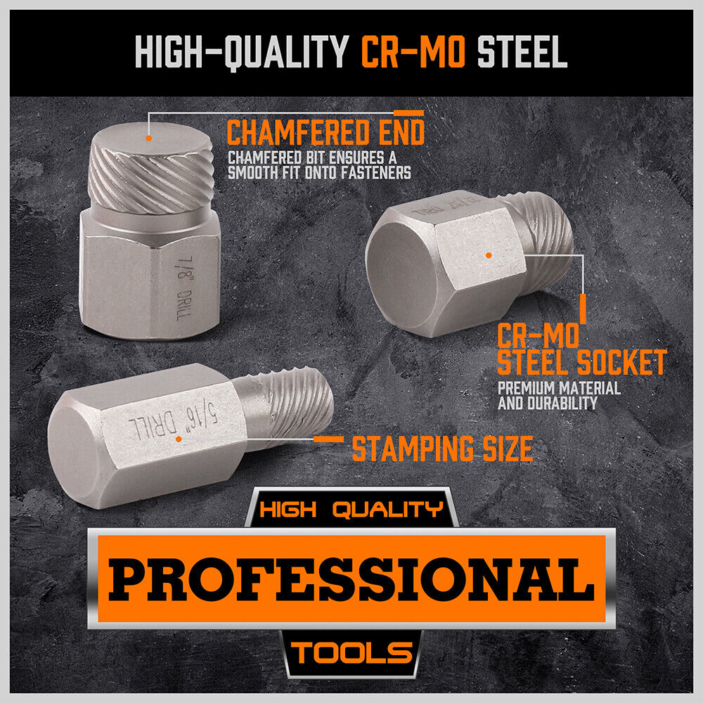 • [PRO-QUALITY]: Premium chrome molybdenum steel industrial grade extractors are ideal for removing broken screws, bolts, nuts, studs, fittings, threaded pipes and pins and is perfect for any mechanic’s tool kit.