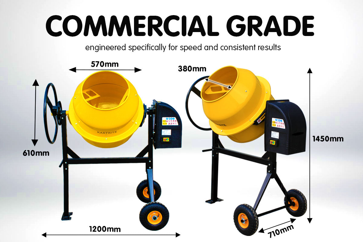 This Kartrite electric cement mixer has a 140L litre capacity bowl. With a flip of a switch, it produces evenly mixed concrete. Equipped with an easy-load heavy duty steel drum, this mixer is also ideal of mixing sand and gravel. It has two10 inch pneumatic rubber wheels, easy to control. which provide convenience for moving the machine around the job site.