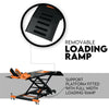The textured surface of this scissor lift helps prevent slippage for a safe working environment. Likewise, the ramp secures the bike in an upright and stable position.