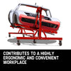 The B2000 car rotisserie features twin 8 tonne hydraulic rams that enable the operator to adjust the height of both the front and rear of the vehicle for greater precision. The vehicle body can be set in 12 pre-set positions, and locked into place with spring loaded pins situated at each end of the unit. It’s equipped with 6x6 inch lockable caster wheels that provide easy transportation around a workshop, or beyond the workshop, while also giving fixed stability whenever necessary. Constructed with heavy-duty powder coated steel, it’s highly resistant to abrasions, oils and greases.