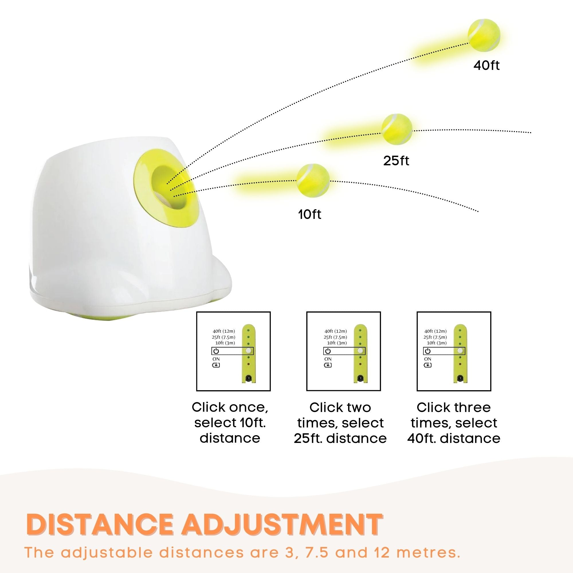 The unit has a rechargeable battery and adjustable distances for the ball to launch so as to suit whatever environment you have available. The adjustable distances are 3, 7.5 and 12 metres and obviously shorter if your dog is quick on the uptake to grab the ball when it launches.