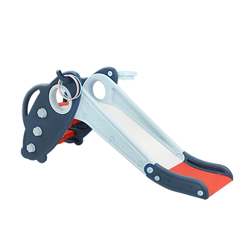 Our Keezi 3-in-1 play set comes with a long slide, ring game, basketball hoop and a bonus ball and pump, giving your child unlimited hours of fun and engaging play. Not just fun, but your kids' concentration skills will also improve with basketball and ring game. Crafted from durable, high-density non-toxic material, this fun-filled slide set has a triangle force structure that prevents tilting. Plus, the non-slip gasket design increases child safety and improves overall stability. Additionally, it has wide, gapless steps, smooth rounded edges, firm-grip handles, and a safe landing slide, ensuring your child's safety while playing. What's most exciting about this play set is its foldable design that frees up your space. So fold it when not in use. You can also use this play set both indoors and outdoors.