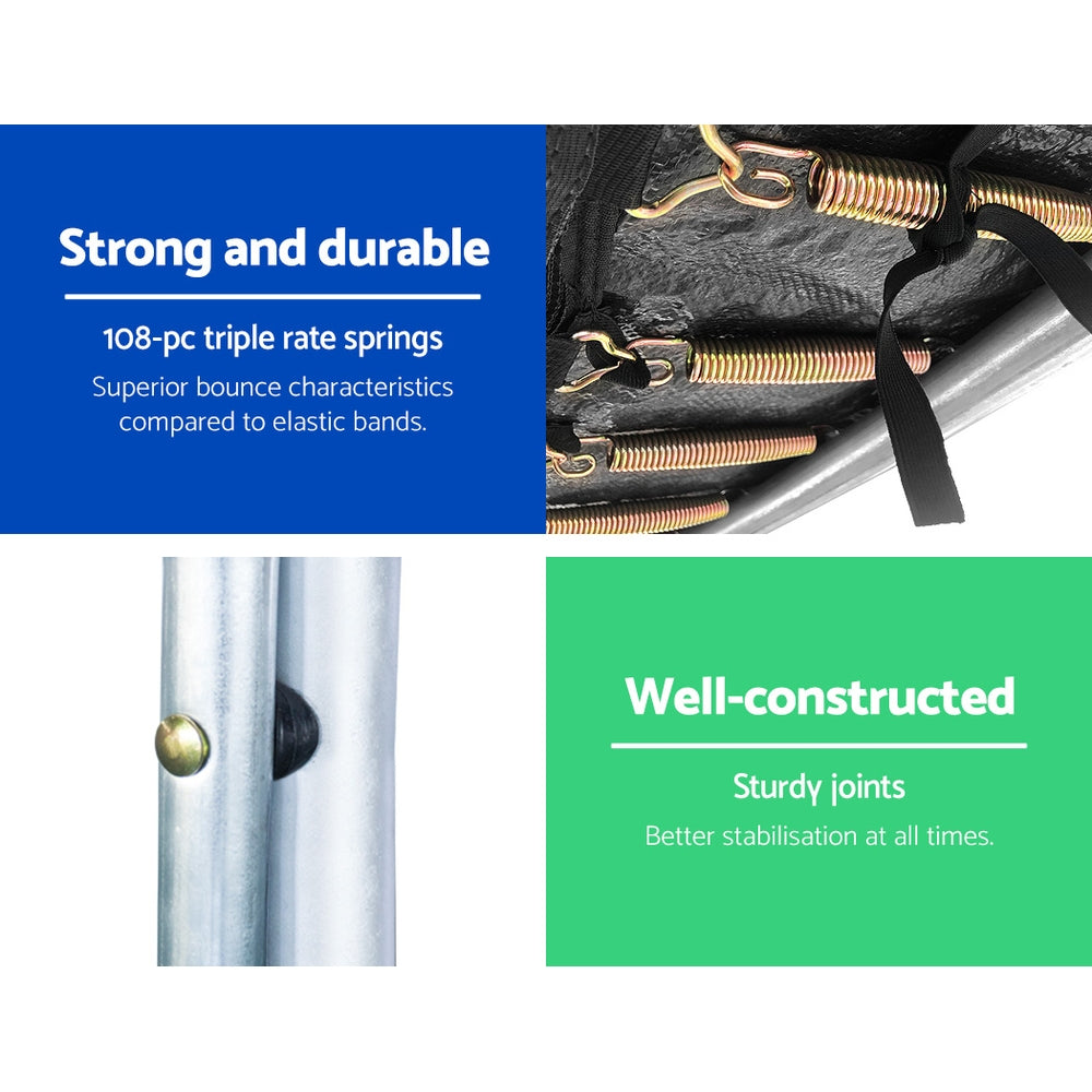 Bounce to your heart's content with the Trampoline. With its superior bounce characteristics featuring 108-piece triple rate springs, the 16-foot Trampoline enables safe and durable bouncing with no worries. The heavy-gauge steel framework is designed to handle all robust play and is UV-tested for quality and reliability. Other great features include a curve design for more rigidness, 20mm thick padding, anti-graze mat, safety netting and a double-lock zip-and-clip entry. Not least, the included basketball hoop, basketball and pump really adds an awesome fun factor to the entire ensemble.