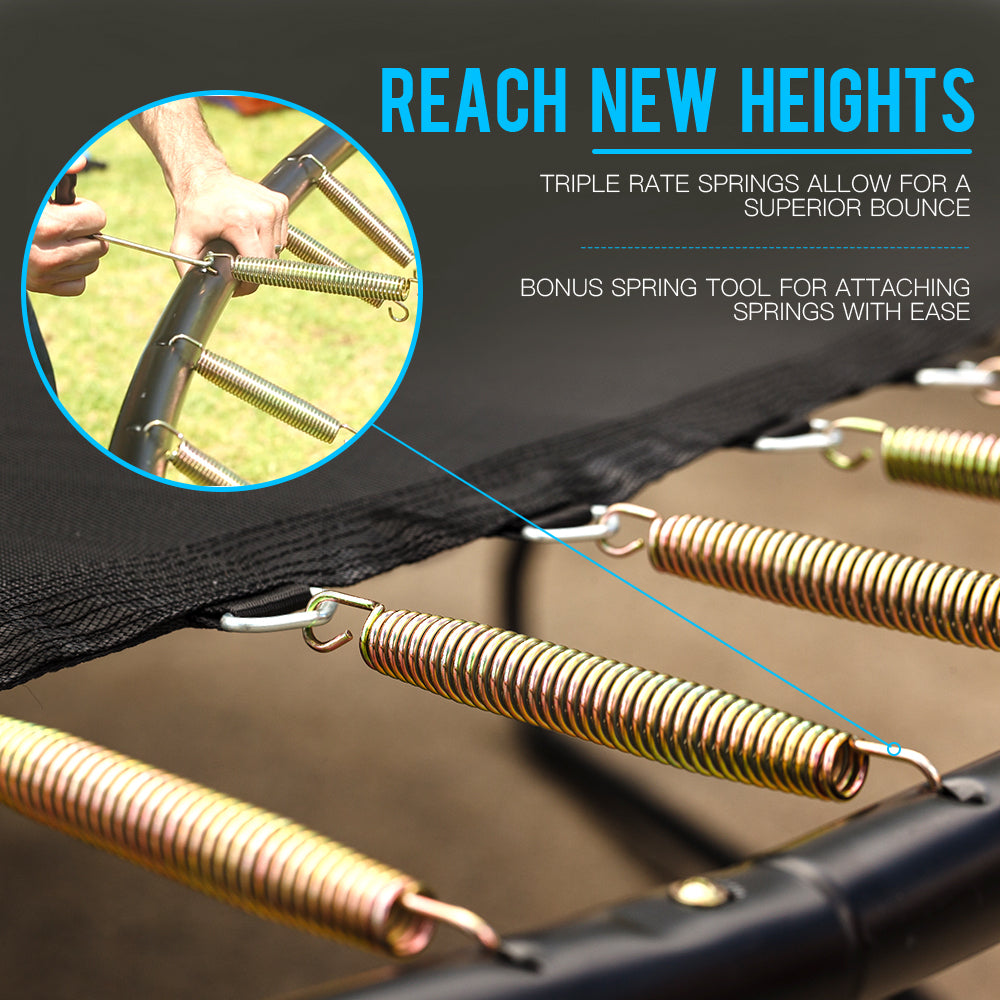 Triple-rate springs, strong rigid frame, curved safety poles, enclosure safety net, safety pads and quality mat create a perfect balance between safety and excitement! This 8ft Trampoline is perfect for young, light jumpers and smaller backyards.