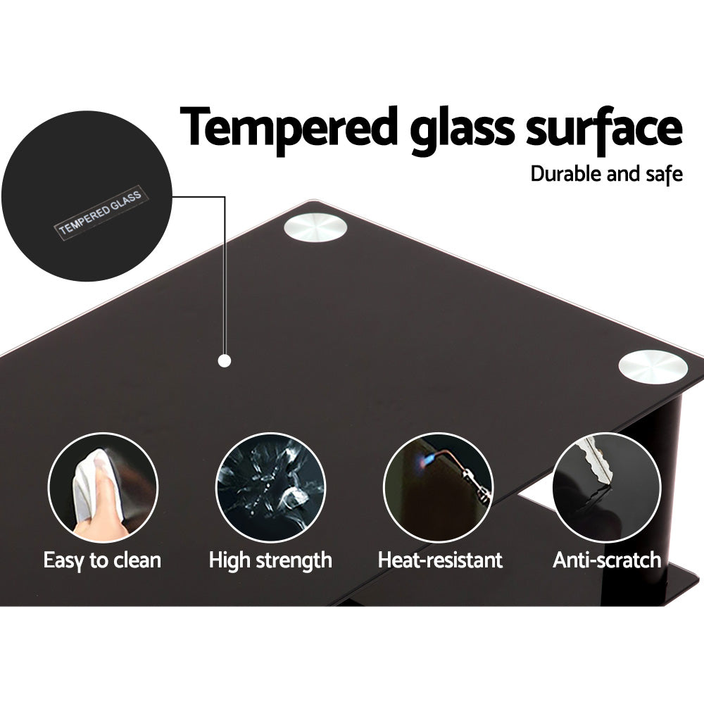 The stand comprises of 4 tiers of tempered glass shelves that provide sturdiness and durability. Additionally, the integrated ensemble is cosntructed from aluminium and finished in sleek black. Each shelf is ventilated to enable good airflow for any media equipment.